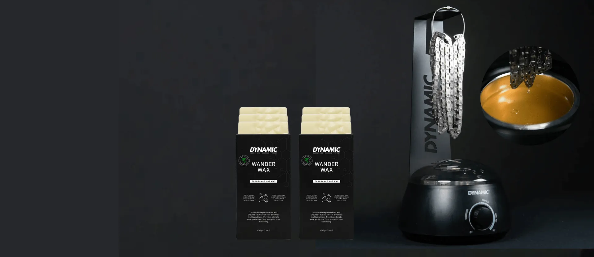 A hot wax is a type of lubricant that is solid at room temperature, but can be melted in a heater or au bain marie. Instead of dripping liquid wax onto the chain such as with Slick Wax or Speed Potion Wax, you melt the solid wax and immerse the chain in it.